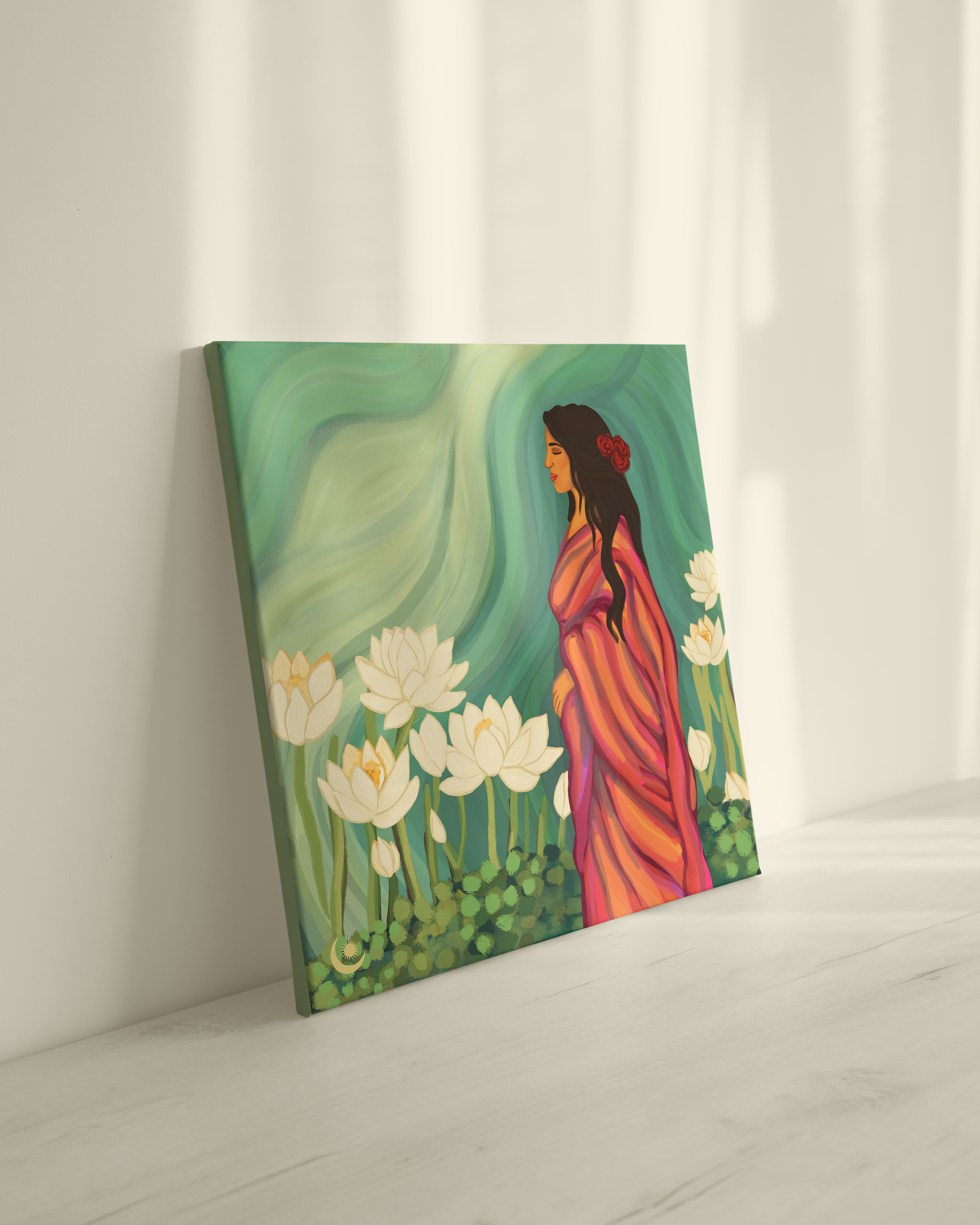 It’s in the quiet moments that we finally hear ourselves. The soft drape of the cloth, the loose curl resting on the shoulder, the flower tucked gently in the hair - it’s not just how she stands, it’s what she carries within. So much waiting, so much feeling, and yet such calm. The lotuses bloom around her, but the real bloom is the one that no one sees, the kind that happens inside, silently, through seasons of patience and hope.