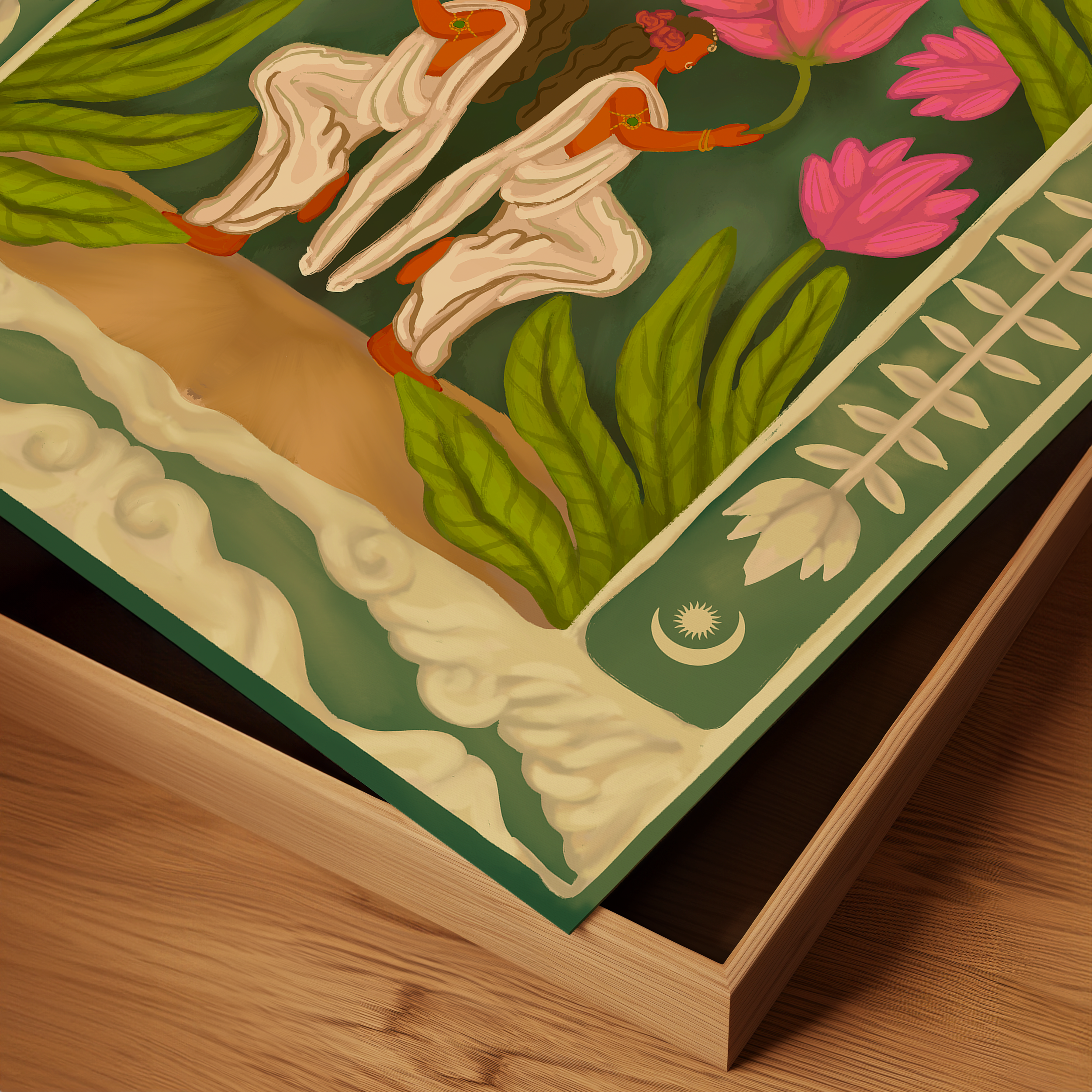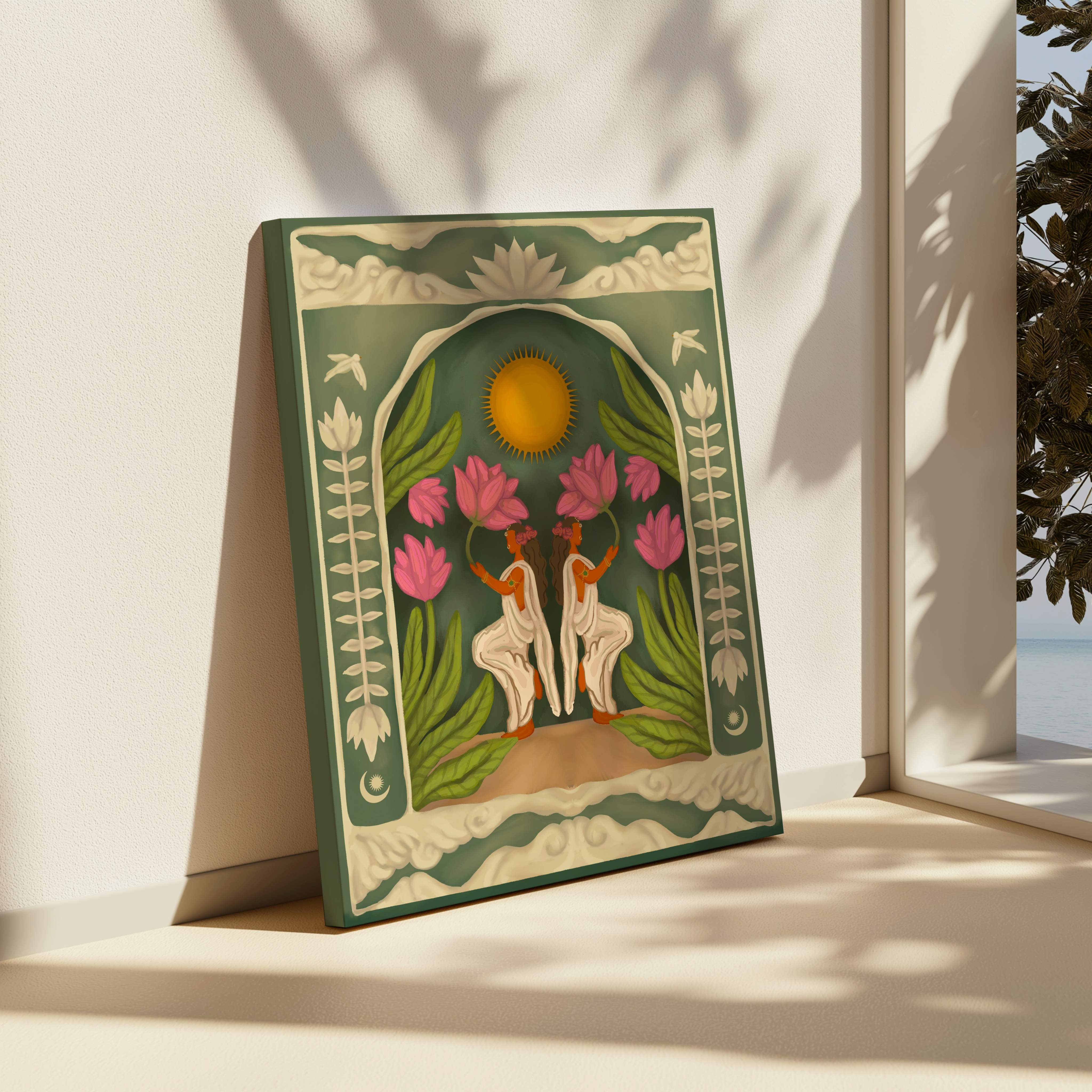 Two mirrored figures rise gracefully, surrounded by blooming lotuses, and the radiant sun above speaks of harmony, abundance, and divine grace. A reflection symbolizing prosperity, protection, and the sacred union of energies, this piece carries a gentle aura of serenity and auspiciousness. A reminder that when blessings come, they often arrive in twos—echoing joy, light, and renewal.
